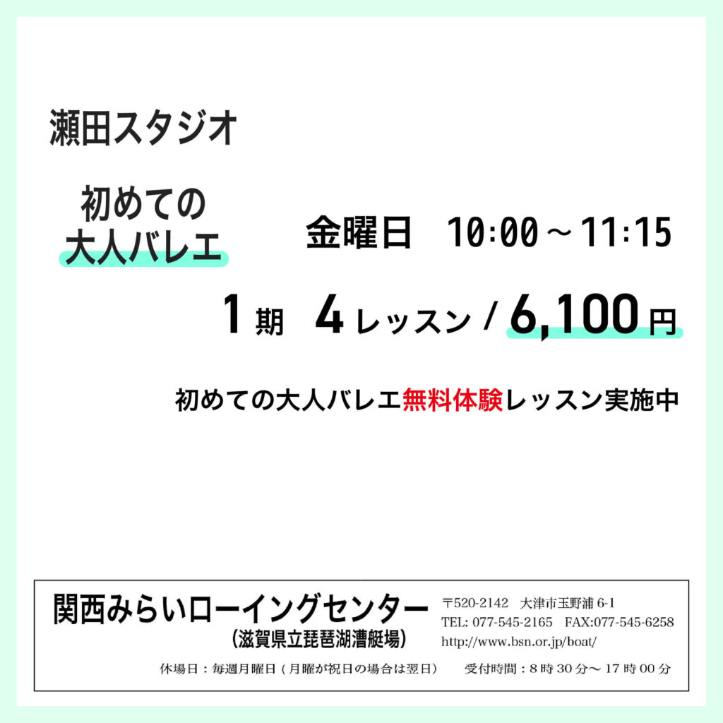 関西みらいローイングセンター大人バレエのご案内 大人バレエお申込みから受講までの流れをご案内させていただきます。 施設紹介 緑の看板が目印です 施設入口 入口右手に事務室があります 到着されましたら、窓口カウンターよりお […]